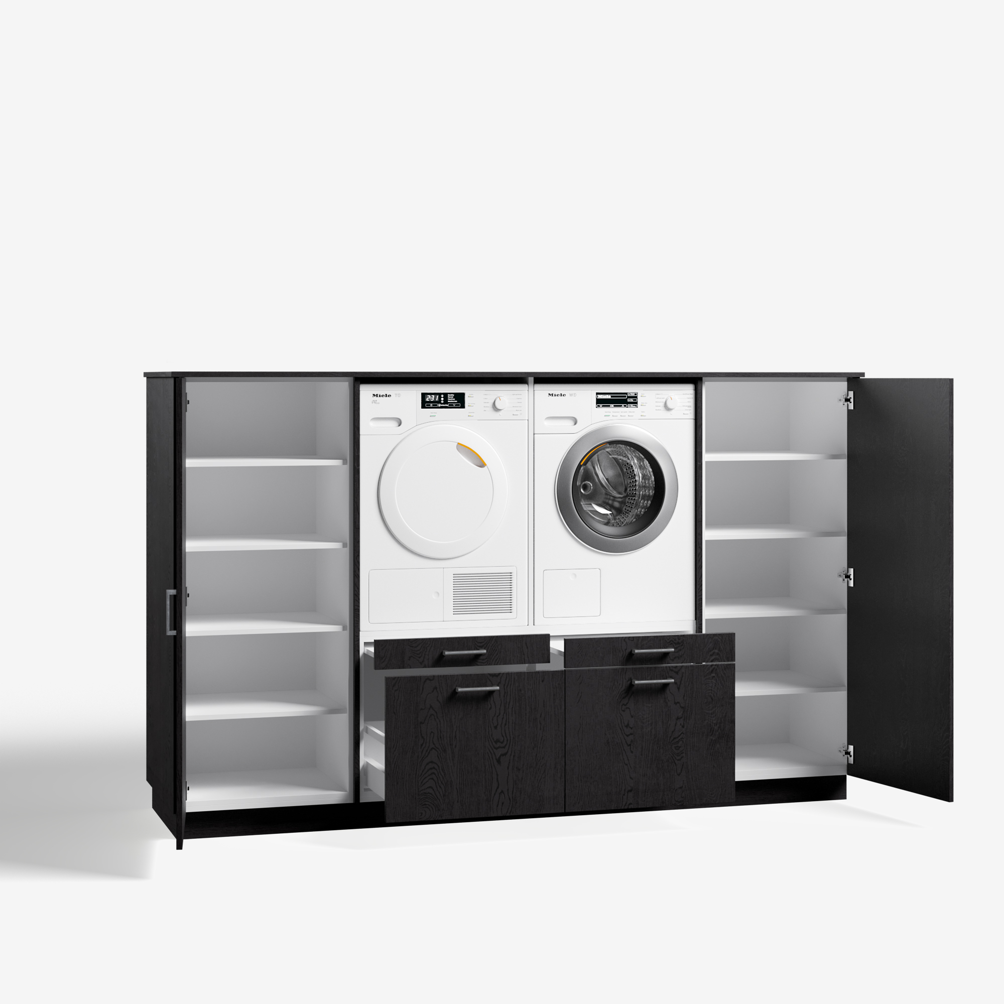 Twee hoge kasten van 60 cm breed aan de buitenzijden, met de wasmachine en droger netjes daartussen geplaatst. Onder de met geluiddempende antislip-matten afgewerkte nissen, vind je twee gemakkelijke uittrekplateaus. Deze soft close schuifbladen zijn perfecte werkbladen voor tijdens het wassen. Handig voor bijvoorbeeld het plaatsten van je wasmanden. Daaronder bevinden zich twee boxlades om wasmiddelen, wasverzachter of andere wasattributen uit het zicht in op te bergen.