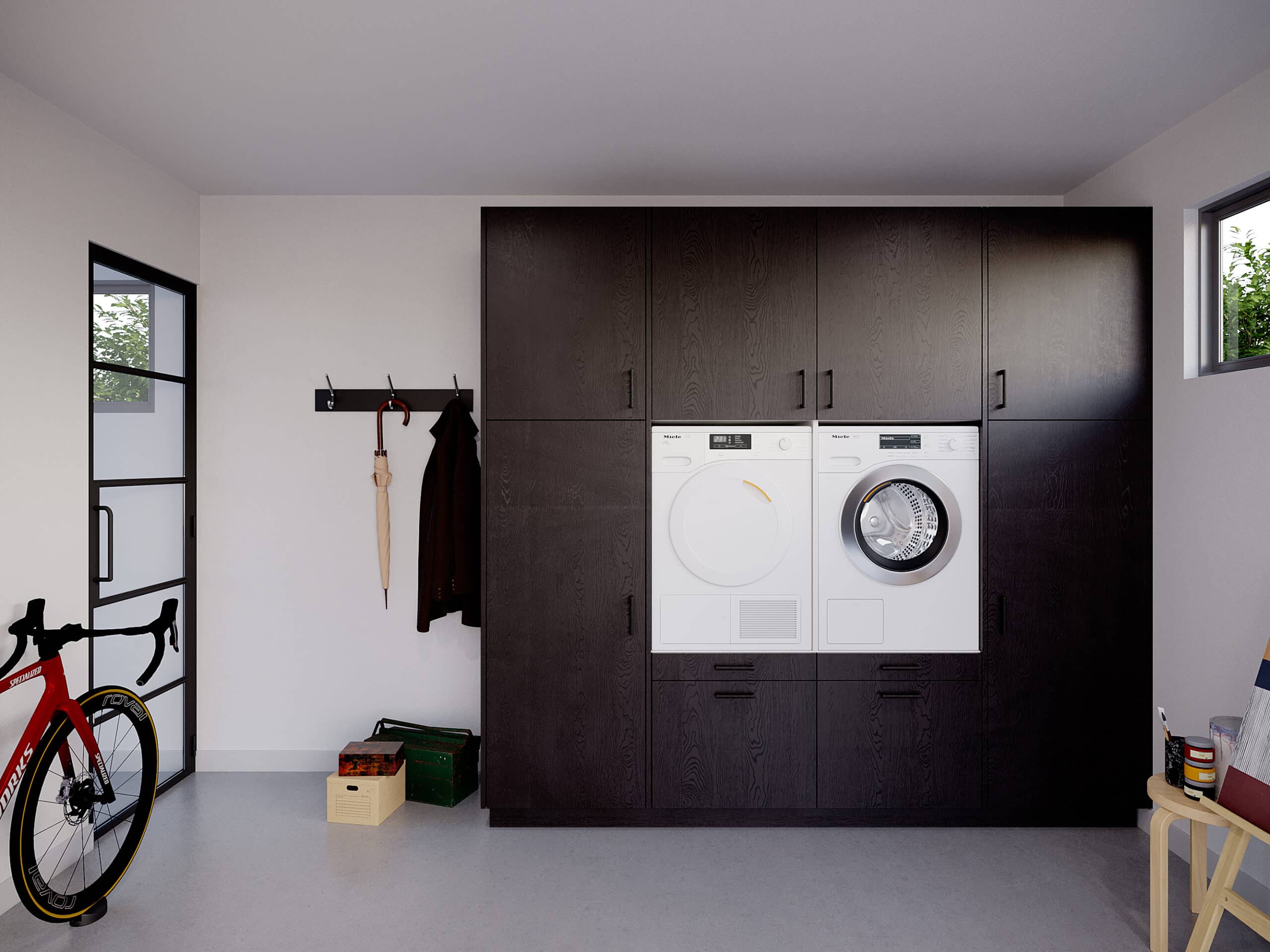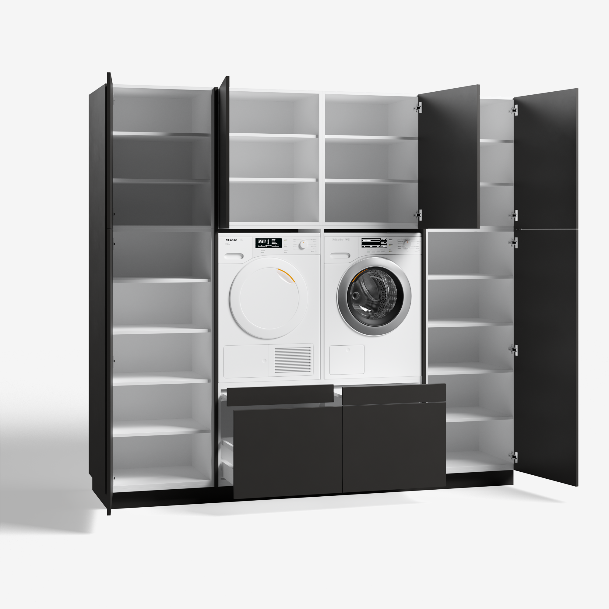 Wasmachinekast Full House is een bijkeuken in de vorm van een design kast. In het midden zijn je was- en droogautomaat op ergonomische hoogte precies op hun plek. Met daaronder twee soft close uitrek plateaus voor bijvoorbeeld je wasmand. De box lades daar onder zijn volledig te openen, ook zo rustig en geruisloos dankzij soft close.