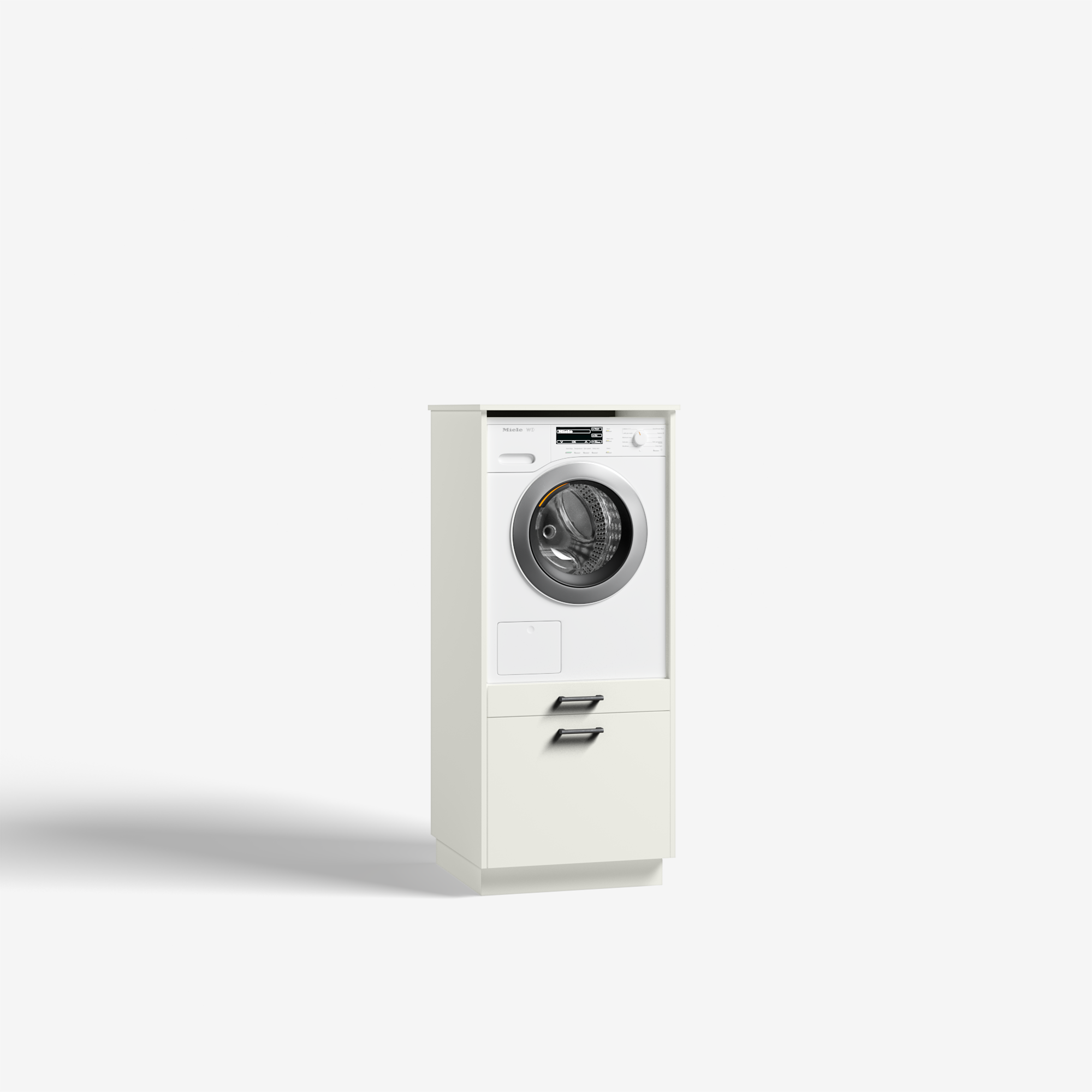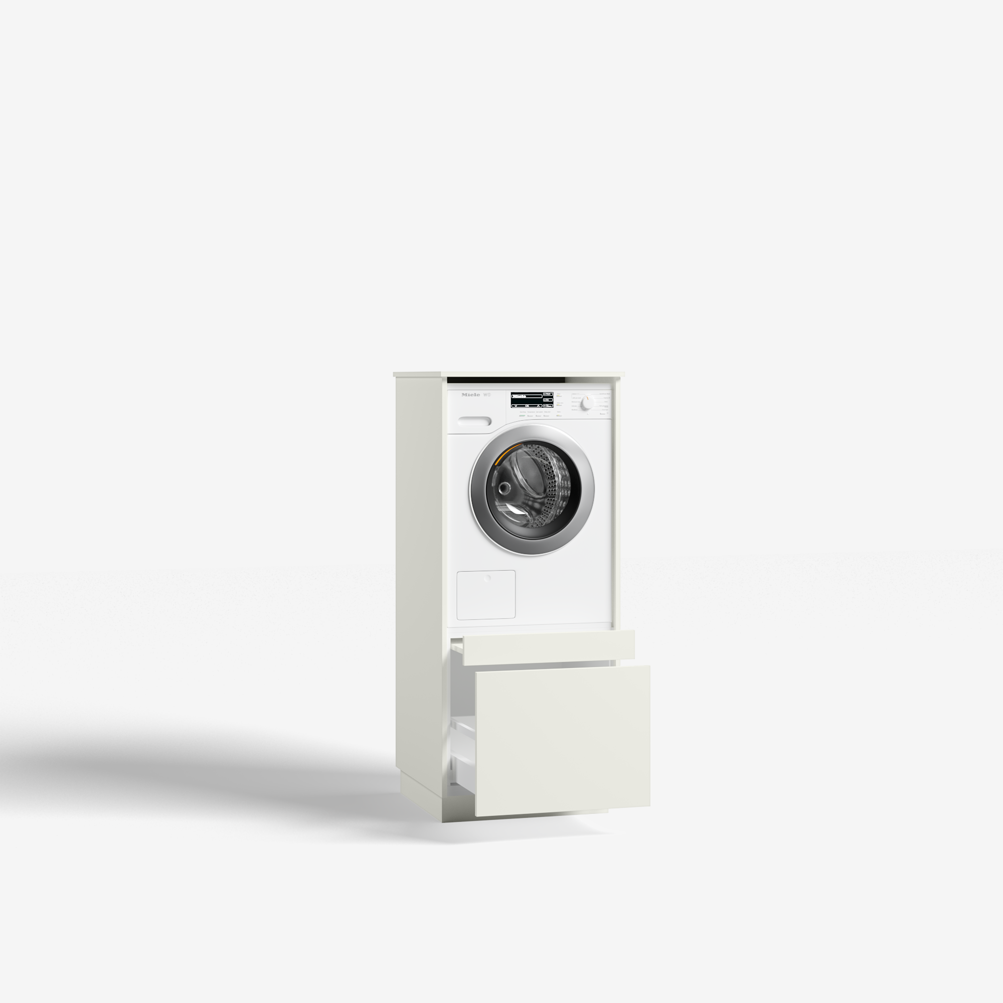 Binnen het ultrastevige frame van de wasmachinekast staat de wasmachine of -droger op een geluiddempende antislipmat. Het ventilatierooster in dit designmeubel zit in het bovenblad, zodat de automaat ook in de kleinste wasruimtes zijn warmte kwijt kan.