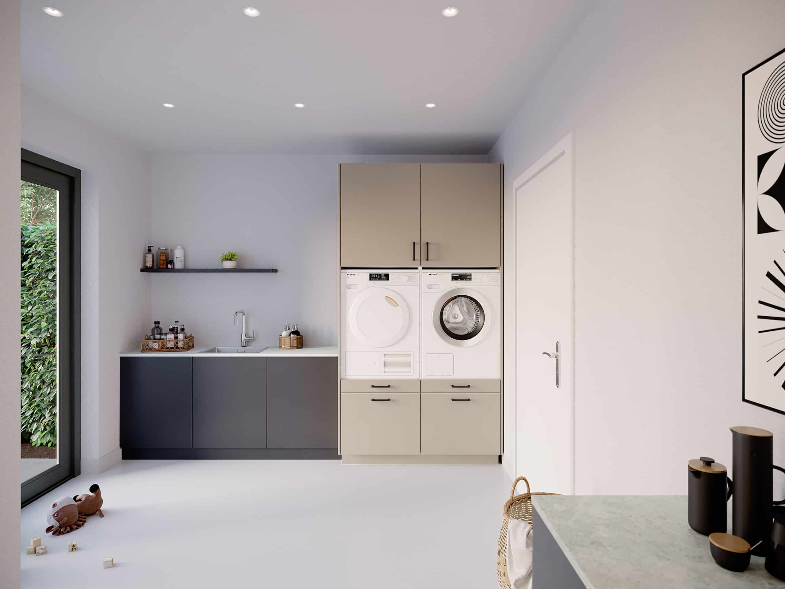 Het slimme design van wasmachinekast Straight stapelt voordeel op voordeel. Twee diepe en volledig te openen box lades met soft close. Twee praktische, soepele uittrek plateaus voor je wasmand. Twee met een tussenwand gescheiden plekken voor je wasmachine en droger. En daarbovenop twee flinke, flexibel in te delen bovenkasten.