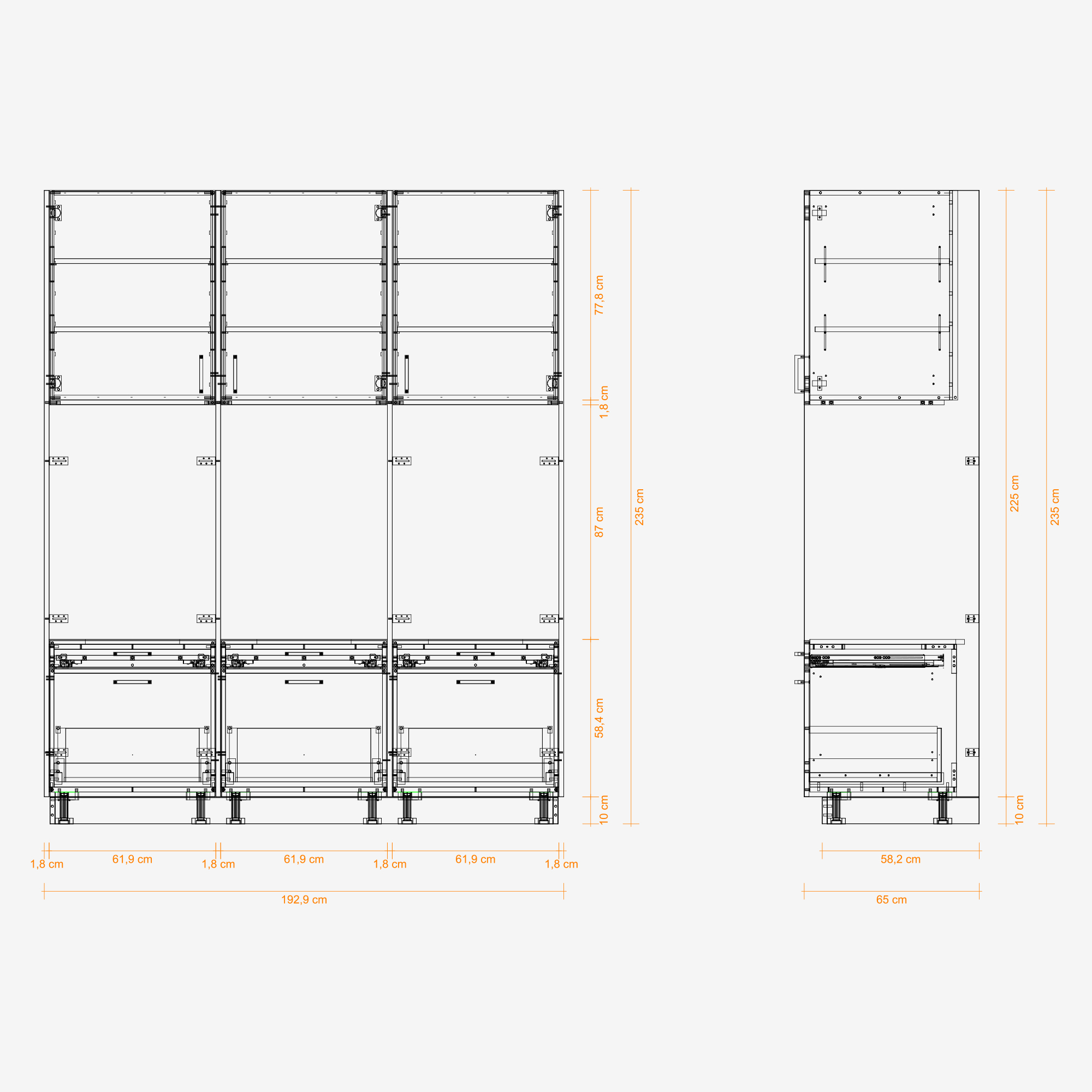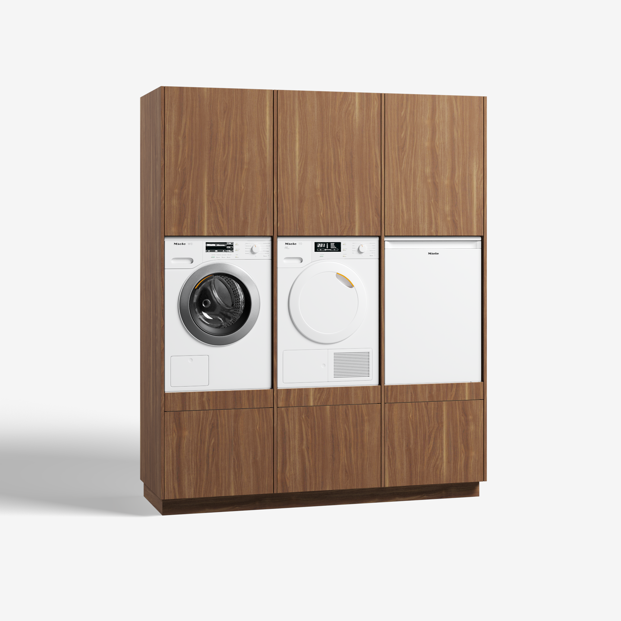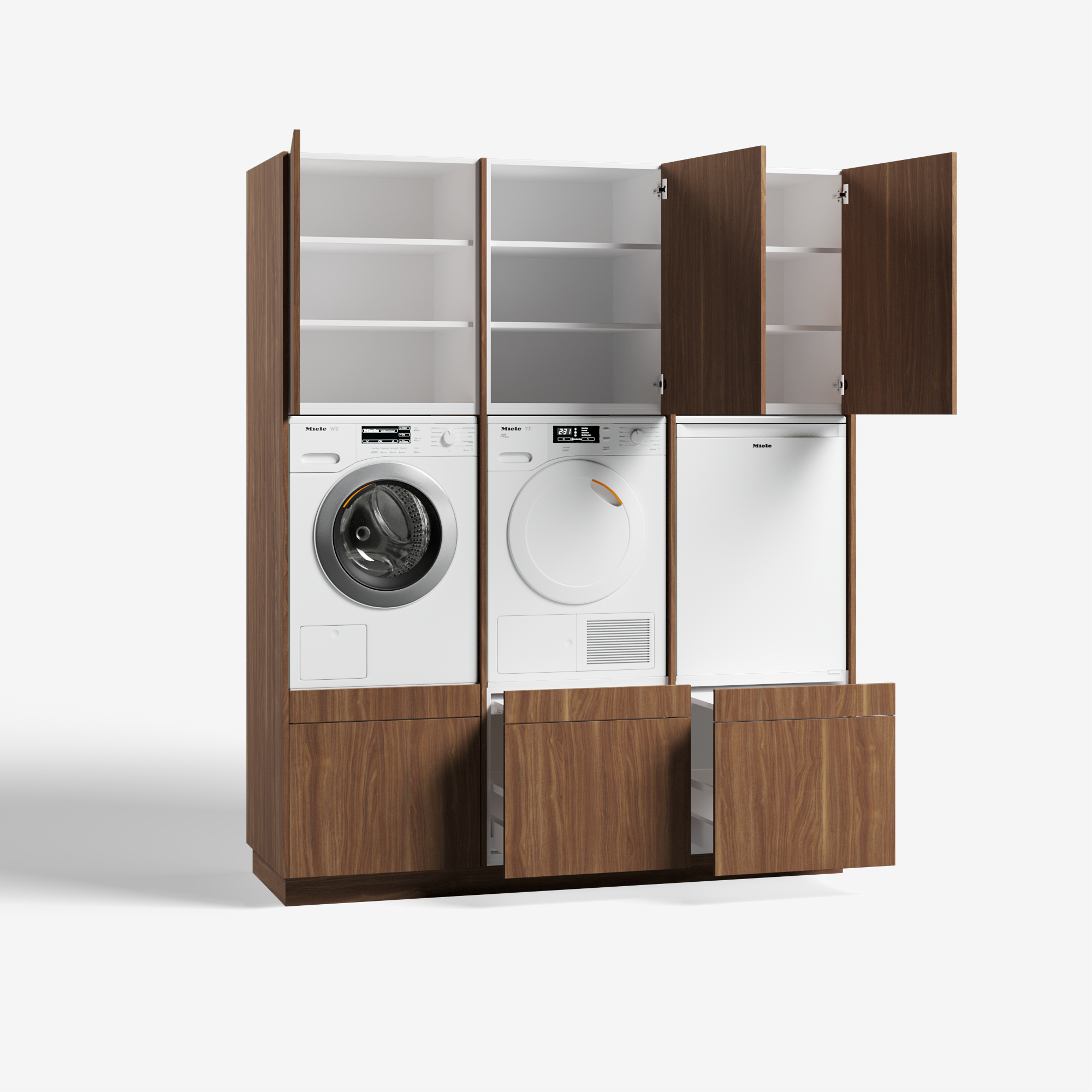 De breedte van elke module is precies die van een standaard wasmachine, droger en kleine koelkast. Je hebt dus een enorme hoeveelheid was- én opberggemak. Dat maakt van Triple Threat de volledige wasoplossing voor elke ruimte. Door te kiezen uit een van onze stijlvolle kleuren, van tijdloos gebroken wit tot modern metallic black, laat je deze kast naadloos opgaan in jouw interieur.